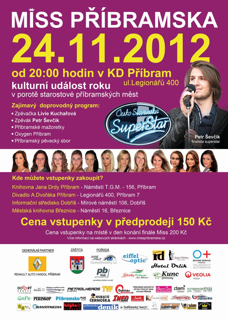 24.11.2012 pod záštitou města Příbram v kulturním domě v Příbrami. Soutěž tradičně pořádá společnost České modelky s.r.o. portál www.ceskemodelky.cz. Vítězka soutěže získá zapůjčení nového automobilu značky Renault na dobu 1 měsíce od generálního partnera soutěže společnosti Auto VANDOL s.r.o.